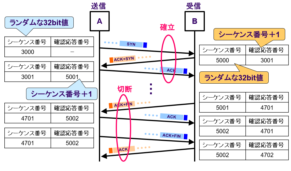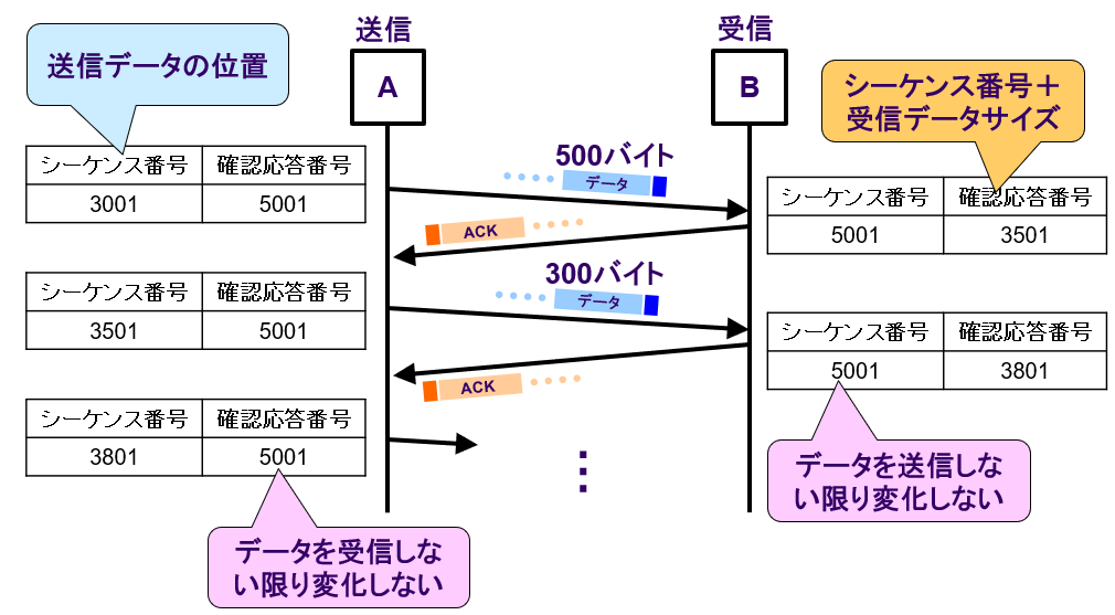 ・シーケンス番号と確認応答番号で確認