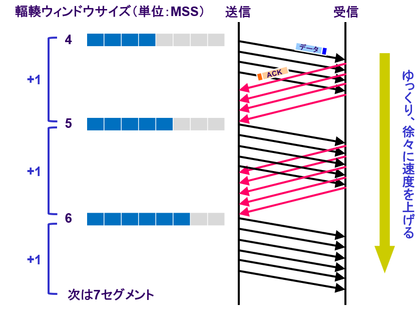 ・輻輳ウィンドウサイズを1づつ増やし、 速度を上げる
